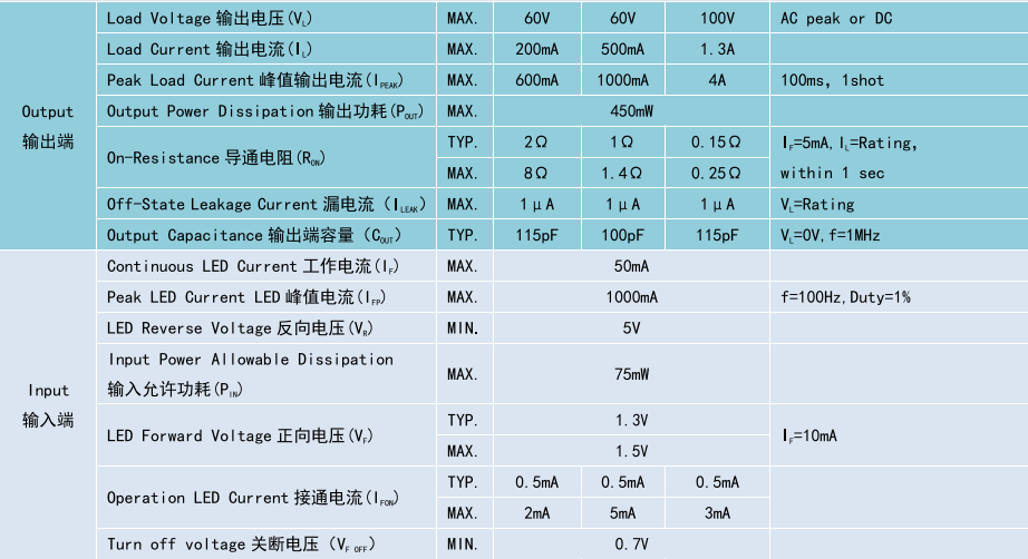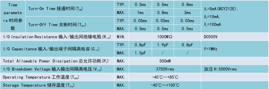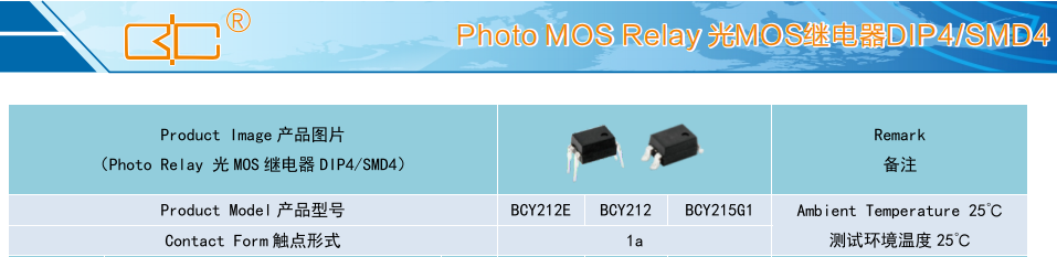 (Relay 光 MOS 繼電器 DIP4/SMD4),Product Model產(chǎn)品型號(hào):BCY212E/BCY212/BCY215G1,Contact Form觸點(diǎn)形式:1a,Ambient Temperature 25C,測(cè)試環(huán)境溫度 25℃