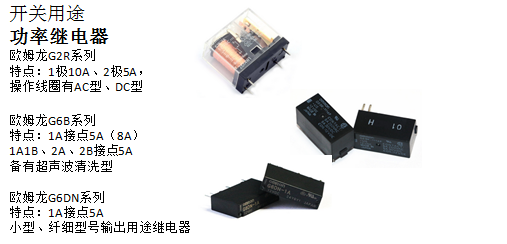 機(jī)床工作的過程中,通常需要通過電源、線圈、馬達(dá)、通電、通用外部輸出來進(jìn)行運(yùn)動的傳輸,此時(shí)繼電器主要起開關(guān)作用,并且對繼電器觸點(diǎn)的開關(guān)容量、觸點(diǎn)可靠性、壽命要求比較高。可以選用以下歐姆龍功率繼電器: