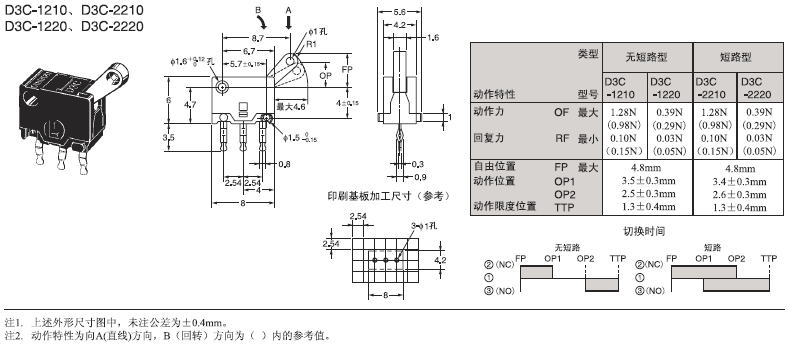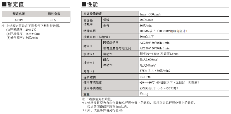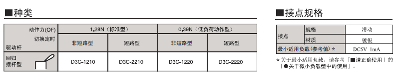 D3C 超級小型檢測開關(guān) 采用滑動(dòng)式的超小型開關(guān) 超小型(高6×寬8×深4.2mm),輕量(約0.3克),3mm的長行程。 由于是滑動(dòng)方式,所以短路、非短路的切換時(shí)間可根據(jù)使用用途進(jìn)行選擇。