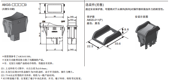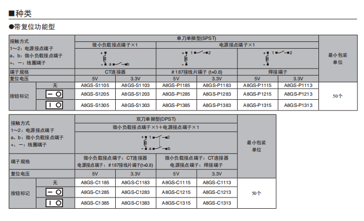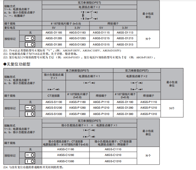 A8GS 遠程復位 船形開關 帶復位功能船形開關 利用基于外部信號的 “復位功能”關閉電源開關,設備的待機功率為零。 適用于浪涌較大的負載的電源ON/OFF。適用于TV-8(浪涌特性117A)。 備有適用于微小負載領域的接點構造種類。 備有可同時ON/OFF微小負載領域、高負載領域的2極規(guī)格種類。 接點間隙大于3mm。 取得UL、cUL標準認證,并符合EN標準。