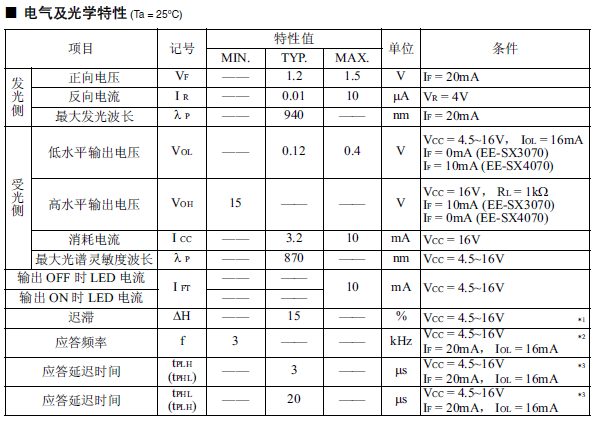 光電IC輸出型微型光電傳感器[透過(guò)型] 受光元件與增幅回路內(nèi)置于一個(gè)芯片 受光元件中內(nèi)置有溫度補(bǔ)償回路 適用電源電壓為DC4.5 ~ 16V 可直接連接C-MOS、TTL 高分辨率(狹片寬度 0.5mm) 遮光時(shí)ON型:EE-SX3070