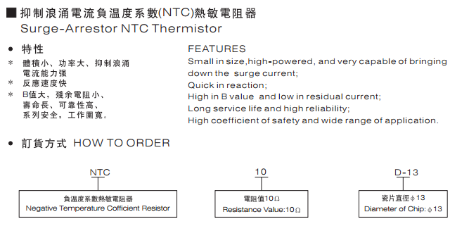 TC熱敏電阻器:是以錳、鈷、鎳和銅等金屬氧化物為主要材料,采用陶瓷工藝制造而成的。NTC熱敏電阻器在室溫下的變化范圍在10°歐姆~10⒍歐姆,溫度系數(shù)-2%~-6.5%。它具有電阻值隨溫度的上升而下降的特性。適用于轉(zhuǎn)換電源、開關(guān)電源、UPS電源、各類電加熱器、電子節(jié)能燈、電子鎮(zhèn)流器、各種電子裝置電源電路的保護以及彩色顯示管、白熾燈及其他照明燈具的燈絲保護。